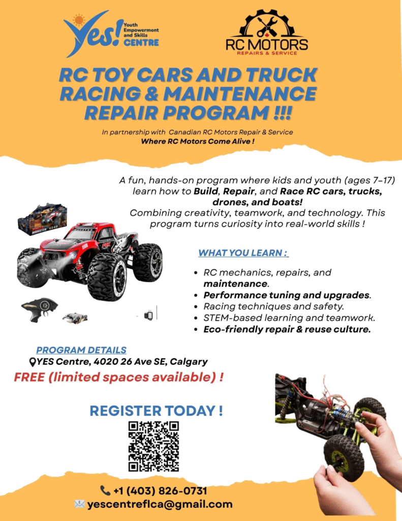 The Youth Empowerment and Skills Centre (YES Centre), in partnership with RC Motors Repair & Service, proudly presents a fun and educational hands-on program for youth aged 7 to 17.